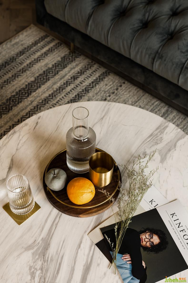 客廳色彩追求時(shí)尚且協(xié)調(diào),大理石搭配金色元素組合的圓茶幾和北歐風(fēng)地毯相結(jié)合,在整體風(fēng)格中減輕了色彩飽和度,視覺空間隨之延伸。