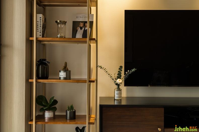 電視角落的置物架上放幾盆綠植,木調(diào)與簡約又不失貴氣金屬線條相互連結(jié),將整個(gè)空間的精致和現(xiàn)代感完美的詮釋。