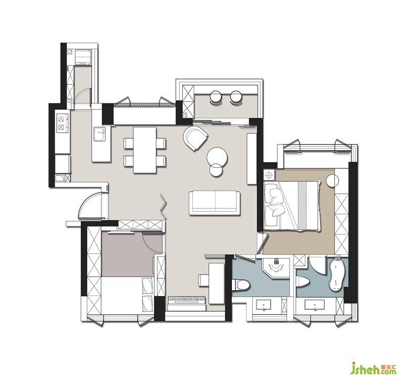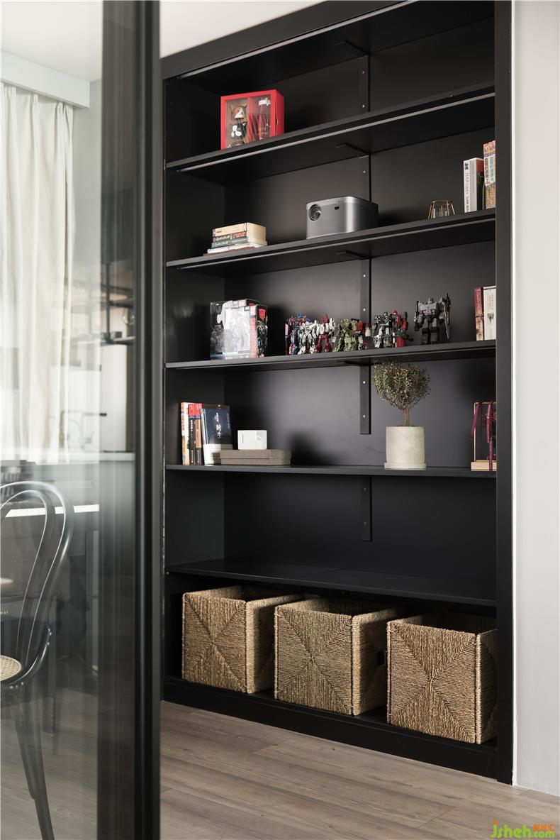 書房借用了次臥的一點(diǎn)空間,做了儲物架,將次臥床頭推平。