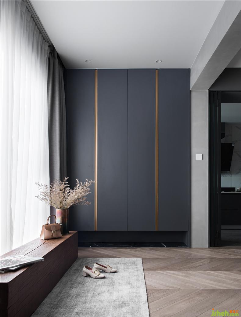 延伸性設(shè)計一門到頂?shù)男瘢酝瑯拥拈L度融入在柜門中的金屬把手,視覺上的美感,室內(nèi)設(shè)計師空間中的高級感。實木的長條木樁,它中和了冷冷的灰調(diào),微微暖化了空間的色彩,達(dá)到了一種平衡