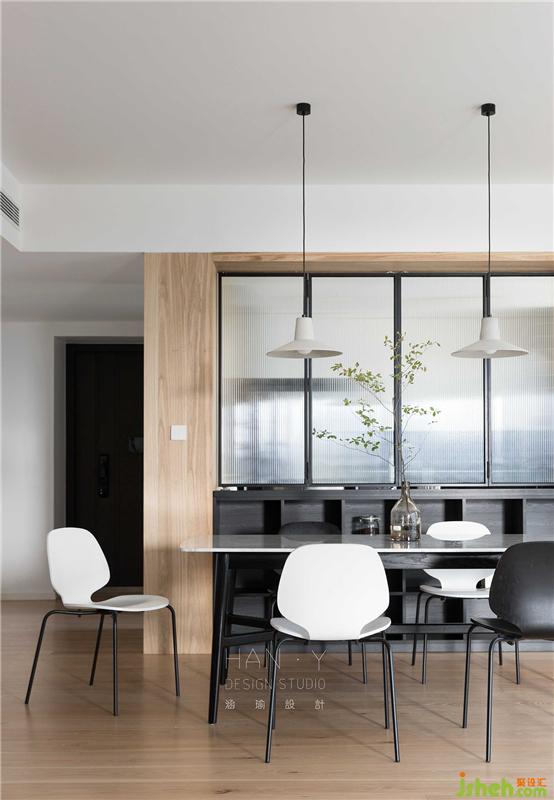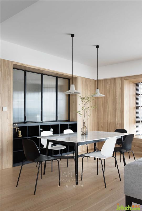 廚房的墻面打掉,入門改了位置,為了增加廚房與餐廳的互動(dòng),開了可推拉的窗戶