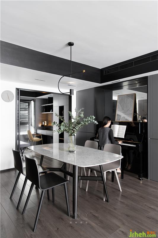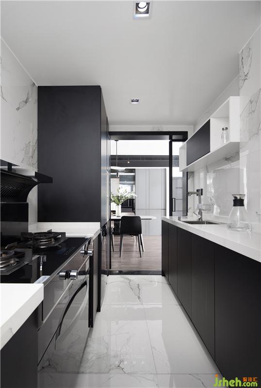 為了避免黑白空間的單調(diào)性,加入了透亮的白色大理石紋理,在無形間給廚房獲得了擴容,縮小地柜的深度增加臺面的空間,布局“二字型”的動線舒適操作,特意設計通透感很強的玻璃推拉門,讓女主人可以盡情享受歡愉的私廚時光。