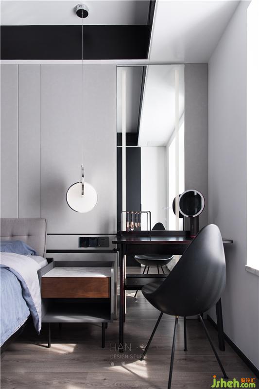 圓形的運用讓靜謐的空間多了一絲柔和,拼色立體的床頭柜十足的線條感,明亮的智能發(fā)光落地鏡,處處都流露著簡約精致的味道,以柔克剛的搭配手法不乏質(zhì)感與穩(wěn)重。