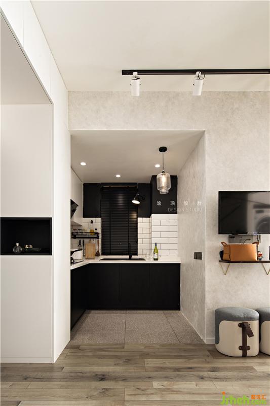 往左邊來(lái)就是廚房的空間,白色墻磚與黑色烤漆板櫥柜的經(jīng)典色搭配,作為無(wú)彩色系的黑白是色彩的兩個(gè)極端,他們單純而簡(jiǎn)練,節(jié)奏明確,顏值高又簡(jiǎn)約前衛(wèi),配上別致的燈光,氣氛便顯得更為溫馨。