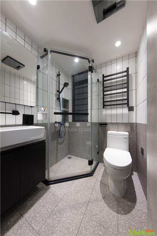 最后就是衛(wèi)生間的空間啦,它就隱藏在電視背景墻背后的空間里,同樣也是黑白經(jīng)典色搭配,小空間是不需要過(guò)多的裝飾,簡(jiǎn)單細(xì)致的線條更能讓人放松。