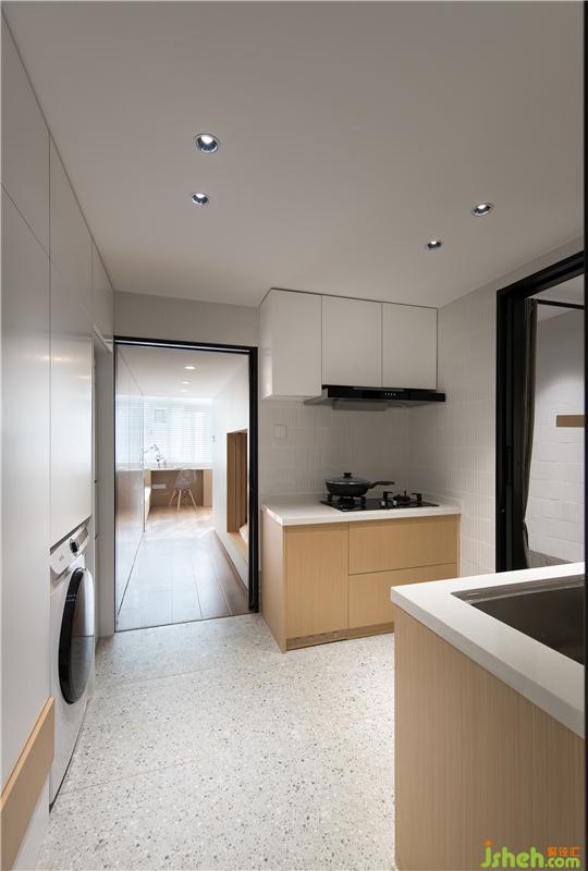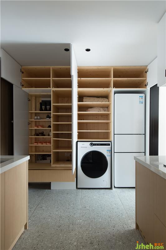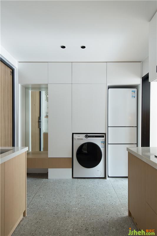 進來就是玄關(guān),由于使用空間比較小,我們將廚房跟玄關(guān)是做了一體的設(shè)計,包括黑色門框里設(shè)計了隱藏式的玻璃推拉門,當(dāng)炒菜有油煙的時候,將這個門關(guān)起來,廚房就是一個獨立的空間,不僅阻擋了油煙,視覺上還是通透明亮的。