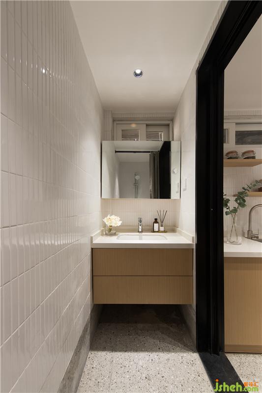 由于空間局促,君君一家人都是在廚房用盆淋水洗澡,如今終于有了屬于他們體面的淋浴室。壁掛懸空式洗手柜臺可以方便清潔,鏡柜是非常適合小戶型的設(shè)計,收納和照鏡子兩不誤。