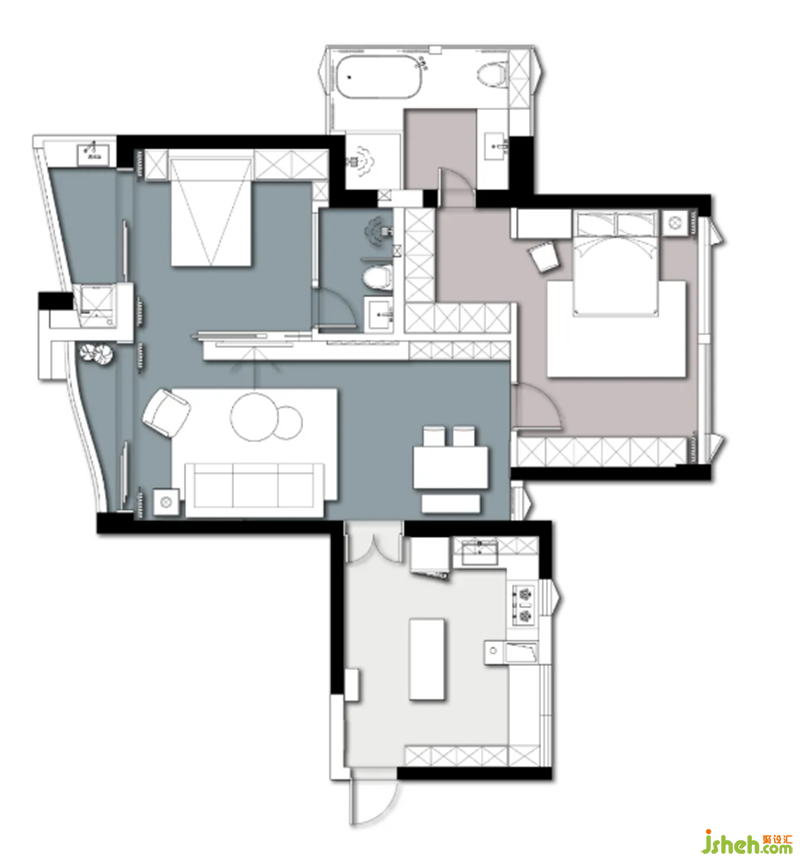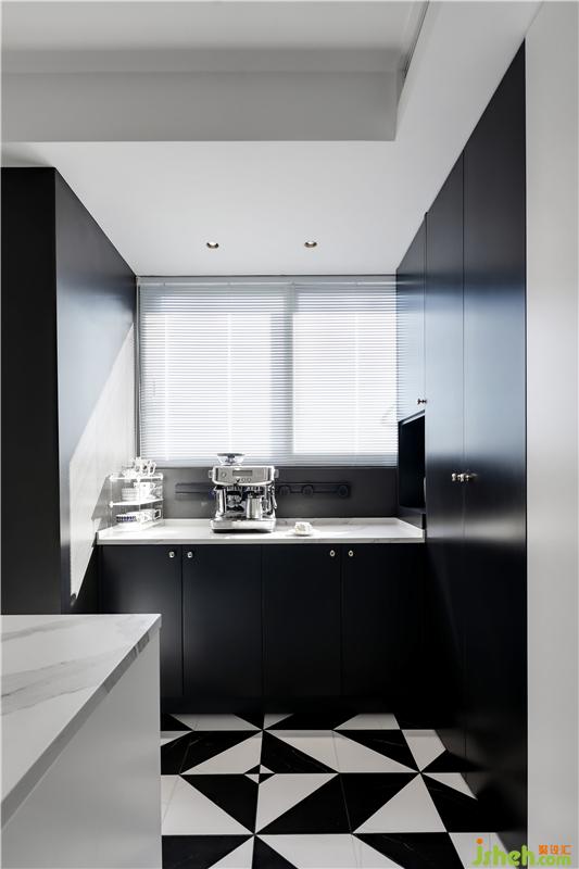 ① 由于原戶型廚房區(qū)域狹小,利用率不高,因此將入戶區(qū)納入合并為中西廚,設(shè)置島臺(tái),增加了早餐及簡(jiǎn)餐的用餐區(qū)域。