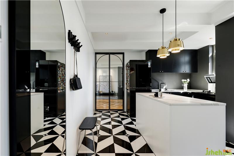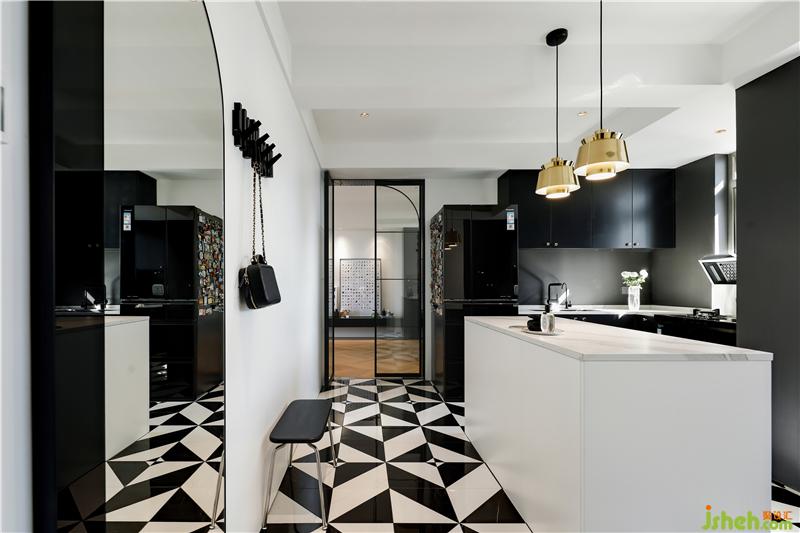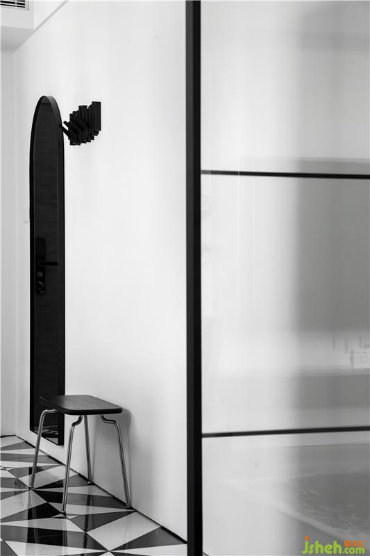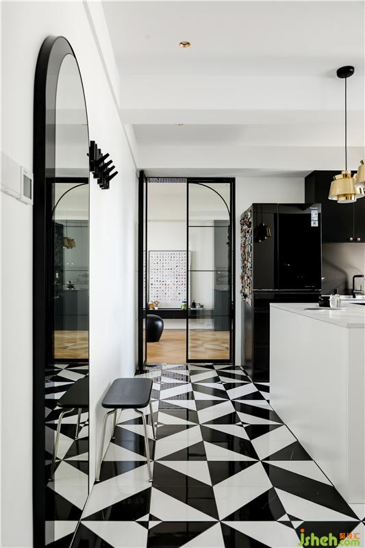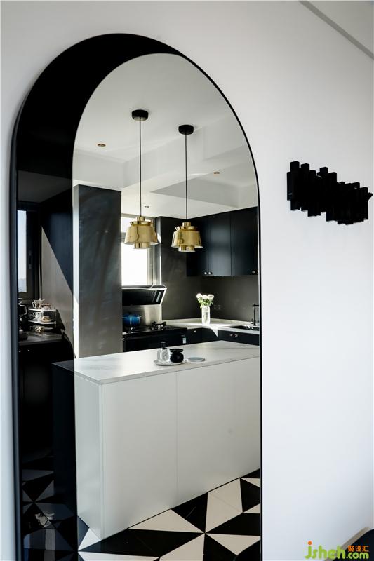 兩個(gè)原本獨(dú)立封閉的狹小空間,如今成為了明亮貫通的開放式廚房區(qū)。充滿趣味的拱形穿衣鏡,與黑框玻璃門的獨(dú)特造型,讓進(jìn)門視線得到緩沖與延伸,保持各自獨(dú)立性的同時(shí)又維持空間的通透性。