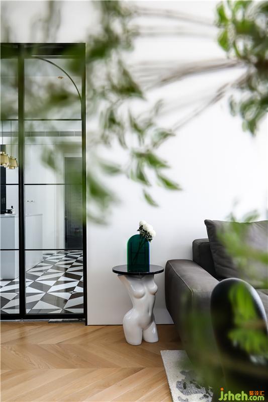 暖色與黑色的結(jié)合,高級的原木色人字拼木地板,營造溫暖陽光的輕盈復(fù)古感。皮質(zhì)沙發(fā)與復(fù)古藝術(shù)邊幾裹挾著歲月的韻味,體現(xiàn)主人不拘的個性氣質(zhì)。