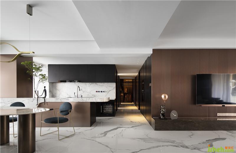 地面上魚(yú)肚白的純凈串聯(lián)生活的各個(gè)空間,通過(guò)經(jīng)典色調(diào)來(lái)呈現(xiàn)空間的比例感,開(kāi)放式設(shè)計(jì)延展了空間格局,木飾面板和巖板恰當(dāng)?shù)膮^(qū)分了空間的使用性。