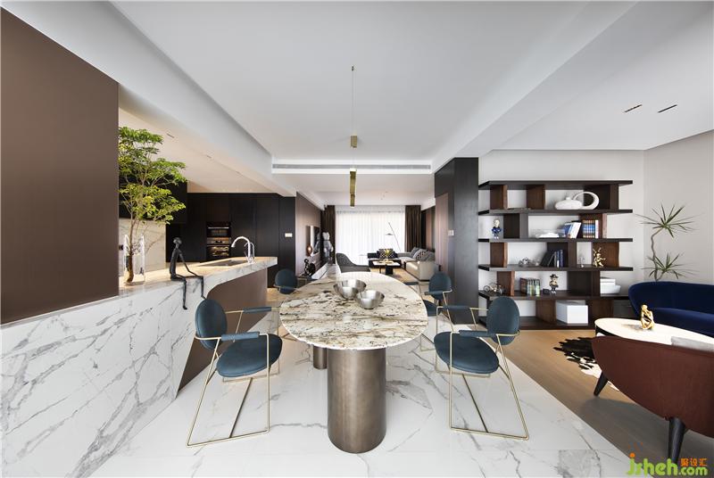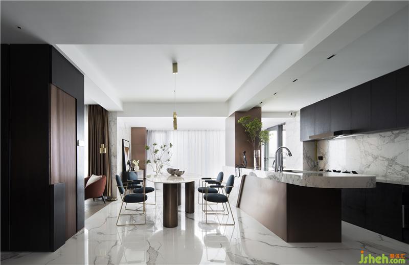 在用餐區(qū),潘多拉大理石臺(tái)面與固定空間整體式巖板島石頭柜臺(tái)相得益彰。餐廳作為承載家人情感的紐帶,也是一個(gè)集溝通、陪伴、味覺(jué)享受為一體的重要空間。