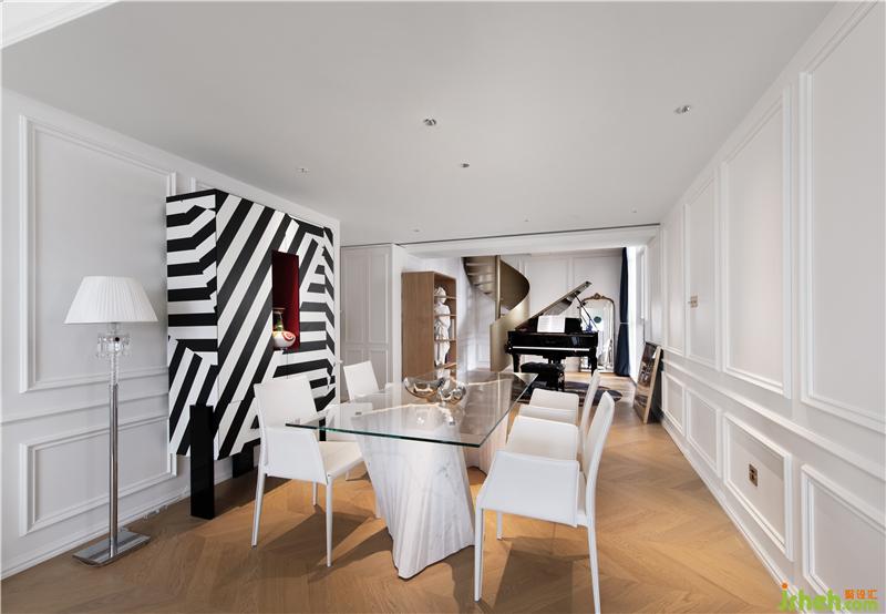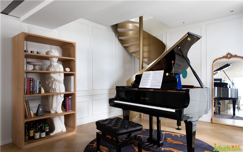 隔墻的阻礙被化解,通往書(shū)房的旋梯內(nèi)移,大開(kāi)放式的布局使功能區(qū)域之間獨(dú)立且關(guān)聯(lián)。唯美的紗簾透過(guò)光影,琴音攜情感自然地在此流淌。創(chuàng)造出充滿藝術(shù)意趣的小世界。