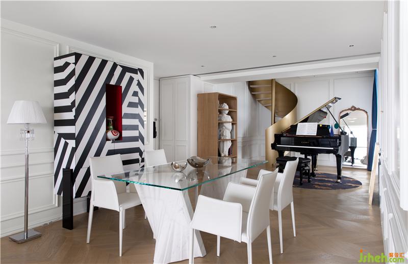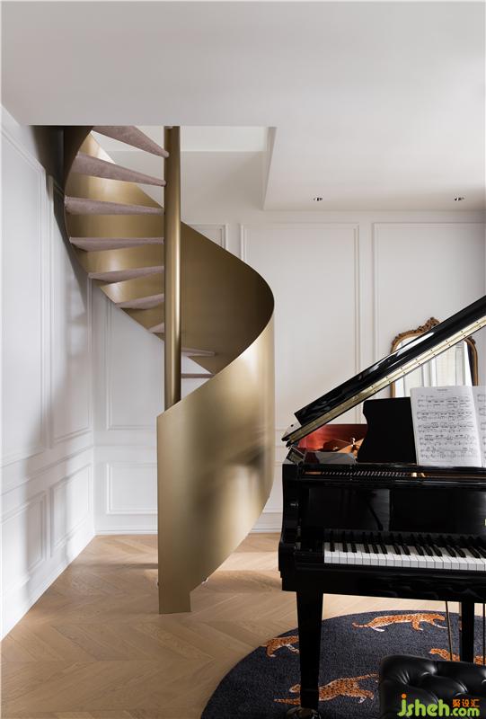 旋轉(zhuǎn)柔美的金色旋梯聯(lián)通居所的不同空間,仿佛帶領(lǐng)屋主穿梭于不同的時(shí)空中。