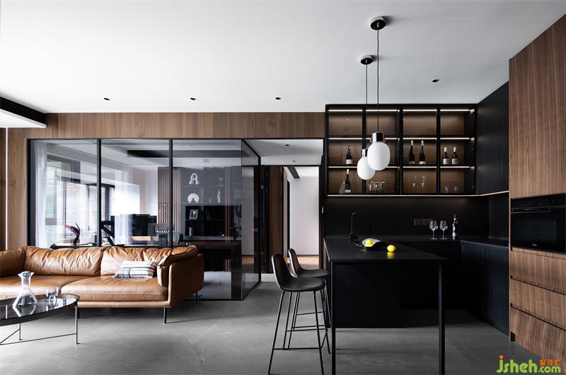暗色系主題的家居設(shè)計(jì)語言搭配胡桃木色將空間兼蓄并收,營造出睿智而低調(diào)的獨(dú)居氛圍感,一面酒柜、一方吧臺(tái),隱匿在黑白二元對(duì)立的酷感中,這是明亮空間里無法帶來的優(yōu)奢與神秘感……