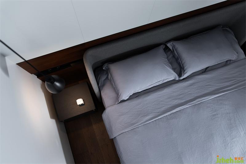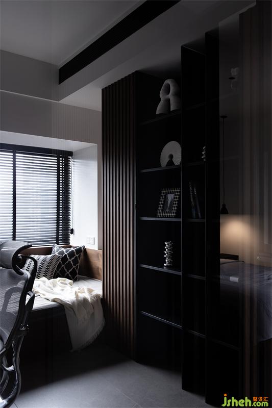 沉穩(wěn)貫通的氣質(zhì)浸染到睡眠區(qū),深黑的酷感轉(zhuǎn)化為裝點(diǎn),加上木質(zhì)的溫潤(rùn)與灰色的深邃,達(dá)到一種波瀾不驚的平衡,白色木飾面板將身心放空,隨之而來(lái)的輕松氛圍使人心緒寧?kù)o。
