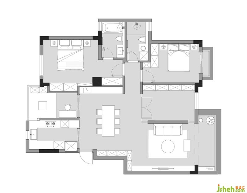 在空間布局上保留原來的四個(gè)房間,將廚房一側(cè)的臥室墻體拆除內(nèi)移形成獨(dú)立書房,拓寬了入戶及餐廳的面積,使中西雙廚成為可能;客廳一側(cè)的小次臥通過墻體改造,空間擴(kuò)大并兼顧儲(chǔ)物,同時(shí)用玻璃材質(zhì)隔斷在視覺上形成統(tǒng)一貫通的自由格局;