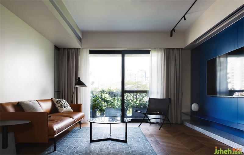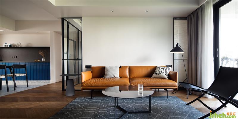 客廳通鋪人字紋木地板,溫潤(rùn)的質(zhì)感與餐廳形成材質(zhì)上的空間劃分,克萊因藍(lán)與愛馬仕橙的張揚(yáng)對(duì)比,一面沉靜溫婉如女主,一面熱情健談如男主。