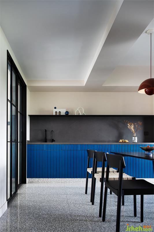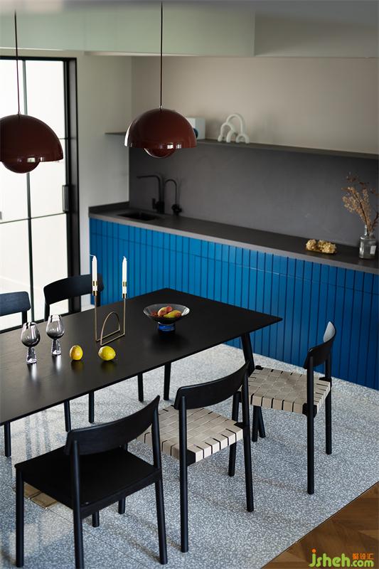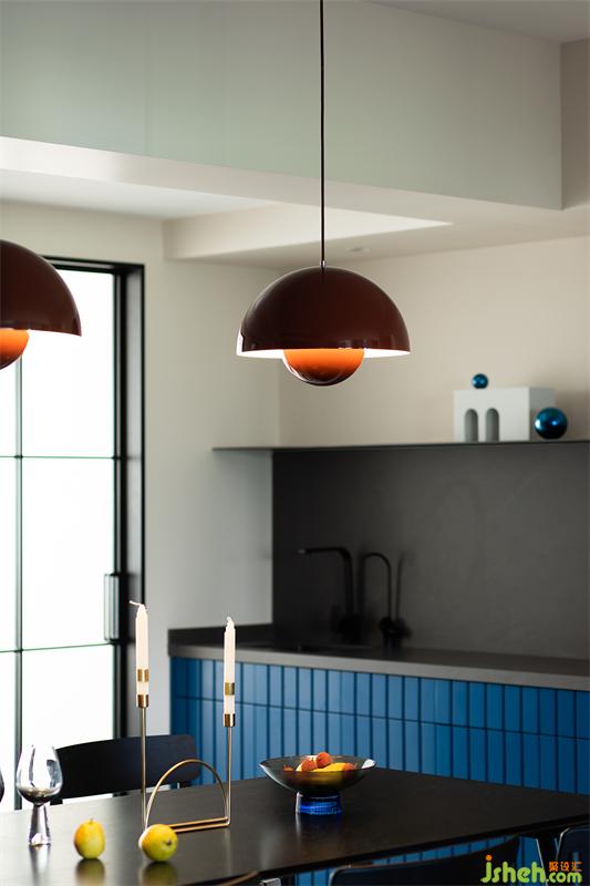 拓寬后的餐廳區(qū),處于開門即見的C位,水磨石地面與餐邊操作臺(tái)形成強(qiáng)烈的視覺沖擊感,酒紅色丹麥cabana的吊燈更是對(duì)整個(gè)空間點(diǎn)綴了一絲復(fù)古風(fēng)情。