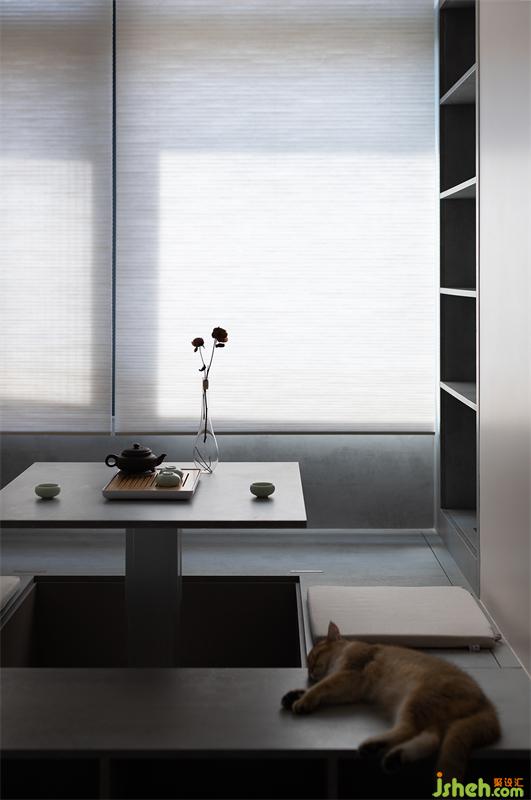 這里是通過墻體拆除保留的空間,作為日常辦公休閑的居心地,流露著一份從容自在。并且可以自由切換生活場景。品茗閱讀、居家冥想、擼貓下棋,都沉淀著一份生活的純粹。