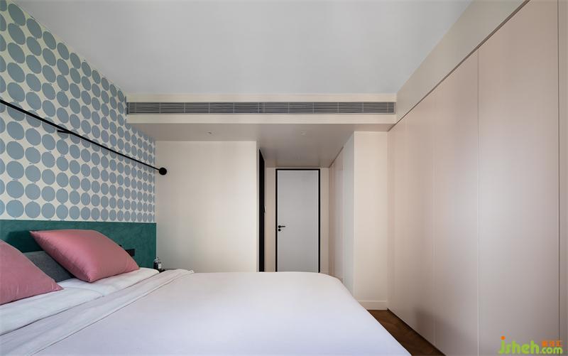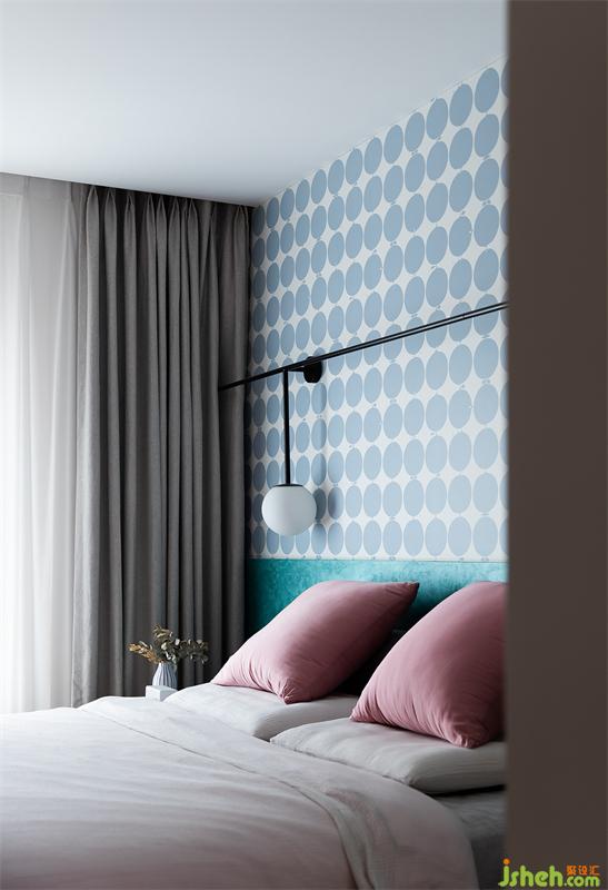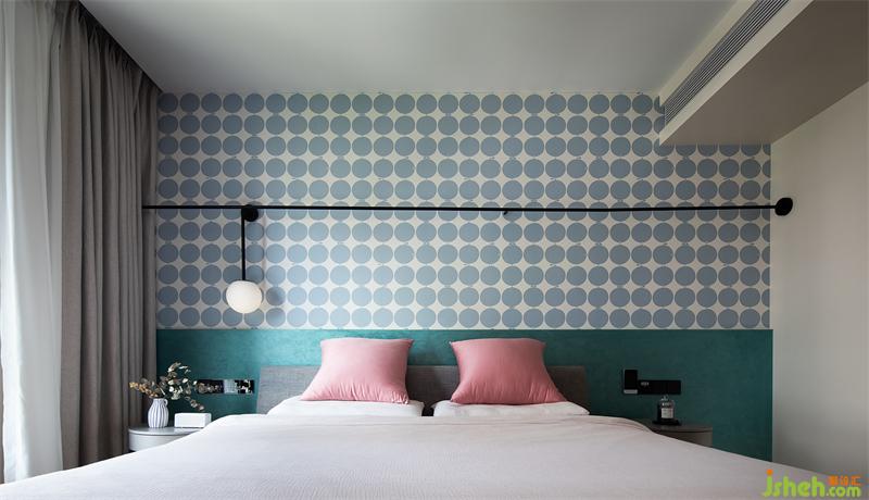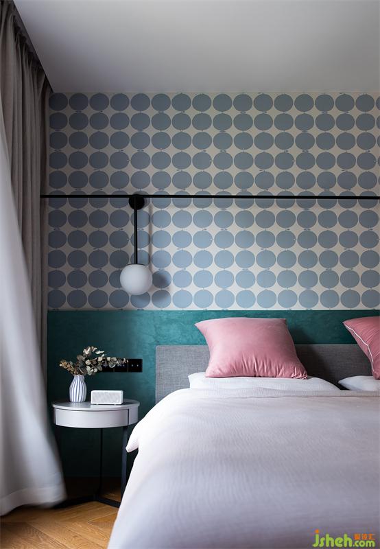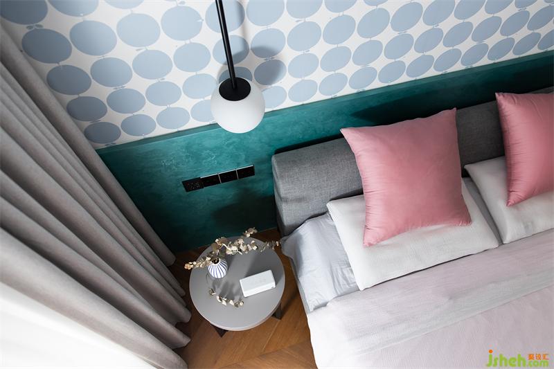 色彩是表達空間氣質(zhì)不可缺少的因素,夫妻二人對于色彩的接受程度較高,床頭背景則用松石綠+平鋪藝術圖案,讓空間多了幾分動人的柔情。
