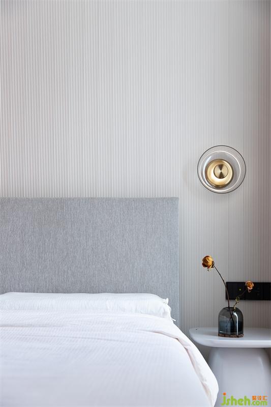 空間以飽和度較低的粉色調(diào)為基底,為室內(nèi)營造出潔凈溫暖的視覺感受。恰到好處的床頭壁燈,把美夢藏進溫柔的時光里。