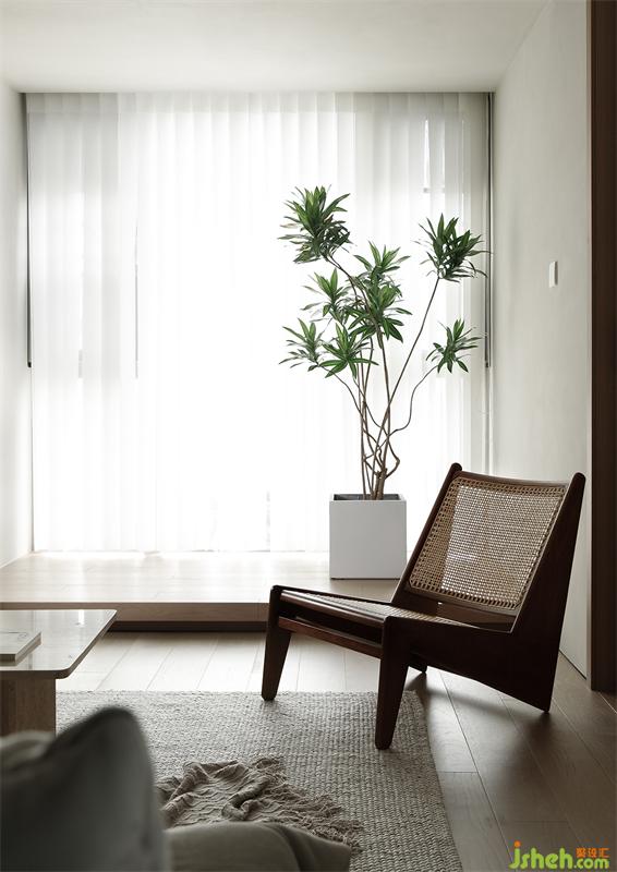 客廳與陽臺之間沒有做隔斷,而是通過調(diào)整地面高低,做了鄰窗地臺,空間界限的模糊也讓家有了更多場景可能性,賦予舒適且美好的生活狀態(tài)。
