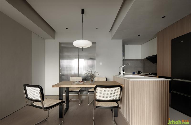① 將獨立的廚房打通,消除擁擠感,開放式餐廚區(qū)帶來烹飪方式的多元化,隱藏式家電讓空間顯得利落統(tǒng)一。