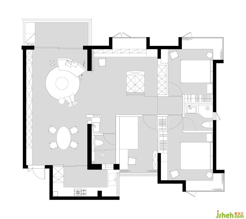 原戶(hù)型墻體過(guò)多、走廊狹長(zhǎng),需要擴(kuò)充收納空間。因此在原有基礎(chǔ)上打破傳統(tǒng)客廳,將原書(shū)房和主衛(wèi)打通連為一體,形成自由開(kāi)放的多功能空間,并在此基礎(chǔ)上做了強(qiáng)大隱形收納,將家中日?;貧w到成員間的有趣互動(dòng)中。利用簡(jiǎn)約柔和的色調(diào)和軟裝增強(qiáng)了交互的隨和性。