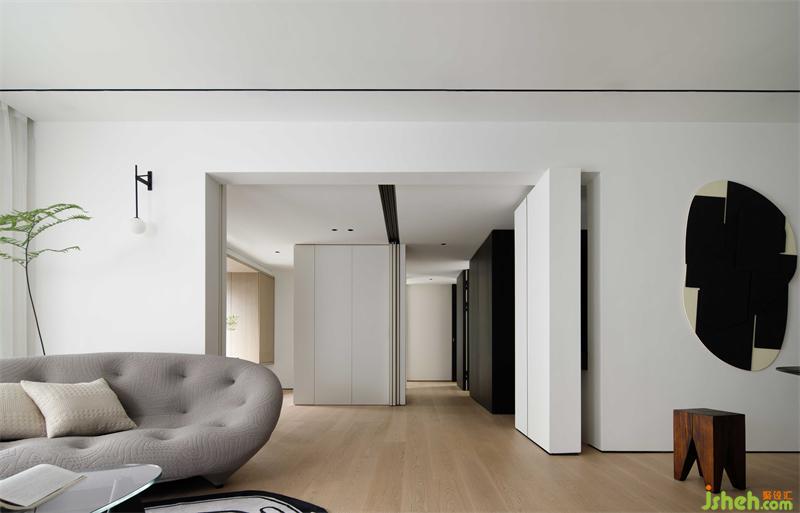 以通透為由,來(lái)處理相鄰空間的聯(lián)動(dòng)情景。通過(guò)結(jié)構(gòu)改動(dòng)和空間的相互串聯(lián),弱化空間的邊界感,增強(qiáng)了區(qū)域間的視野聯(lián)系。是具備更多靈活變動(dòng)性的開(kāi)闊空間。