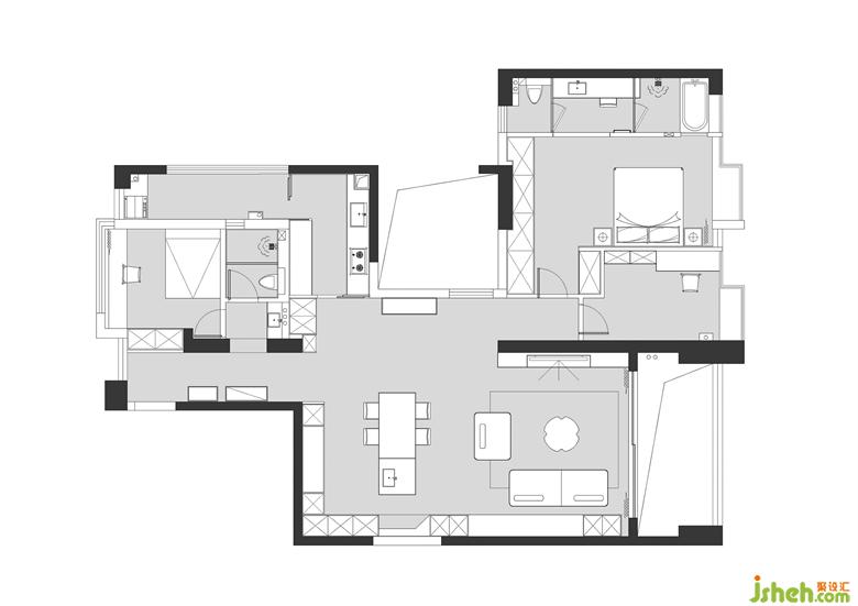 · 原戶型采光通風(fēng)良好,公共區(qū)域視野開闊。根據(jù)屋主需求,結(jié)構(gòu)上保留了原本的三個(gè)房間,在公共空間的處理上,空間功能沿著模糊化、多變性的方向發(fā)展。