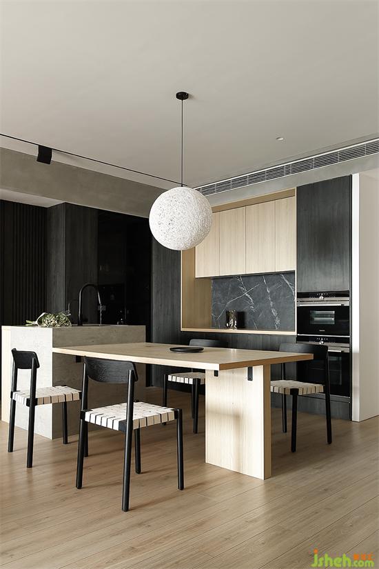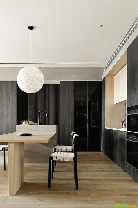 在餐廳的一邊設(shè)計(jì)了兼酒柜、西廚、嵌入式蒸烤箱、收納柜于一體的多功能“墻”,為交融的空間提供功能性的收納。家裝設(shè)計(jì)木色與灰黑的素色基底給日后增添精致小電器等提供了很好的發(fā)揮空間。
