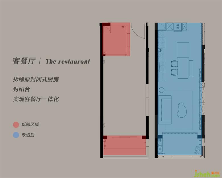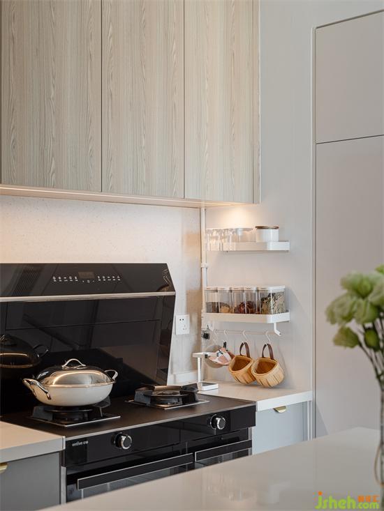 為了實現(xiàn)更為合理的空間布置,將之前采光差的廚房墻體拆除做成了開放式,島臺餐桌相連,原本狹窄的過道也變得更為寬敞舒適。家裝設(shè)計進入室內(nèi),迎面而來的煙火氣最能撫慰忙碌了一天的身心。