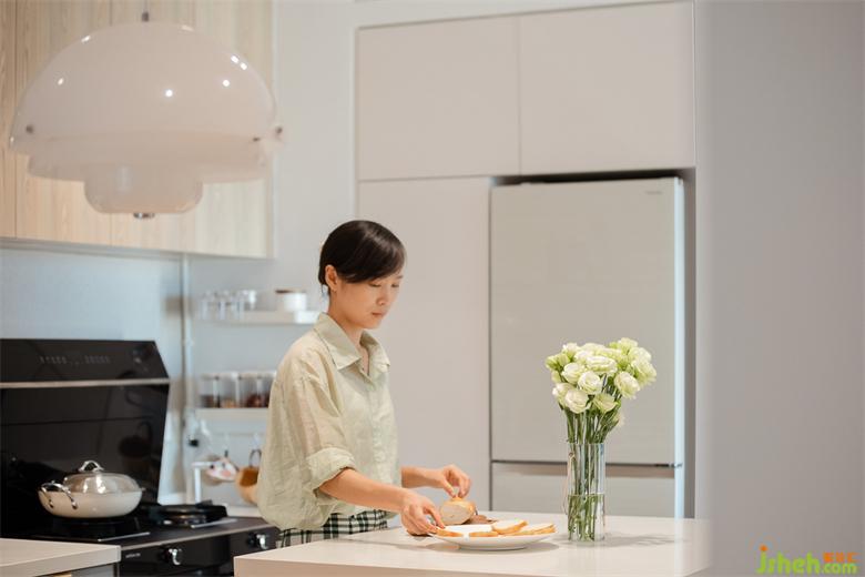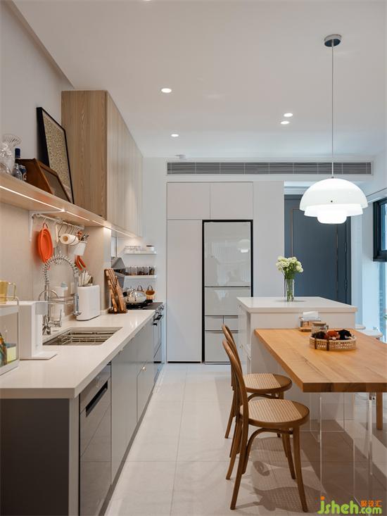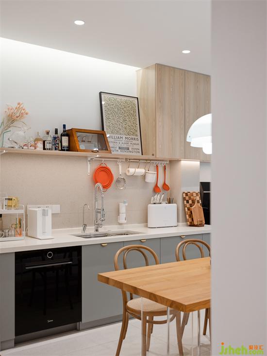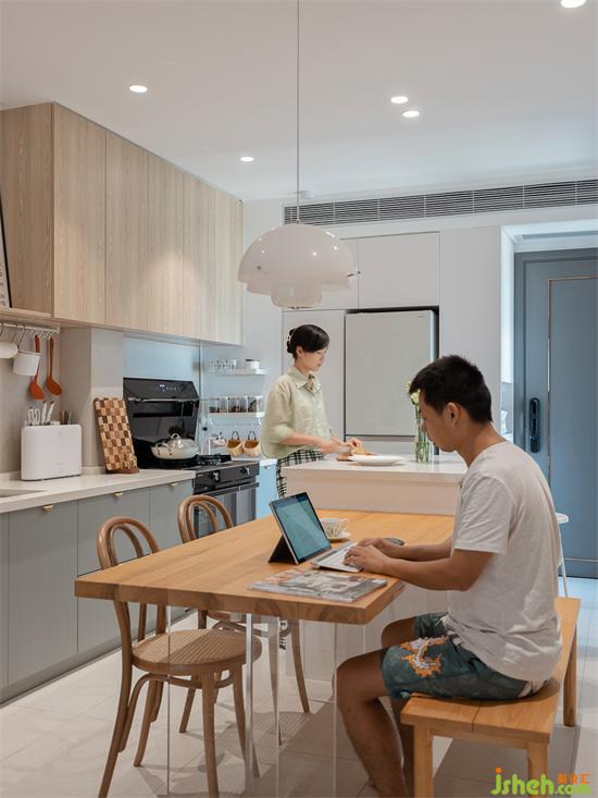 足夠的操作臺(tái)面釋放出更多的功能,廚房同時(shí)兼具水吧、餐邊柜的作用。家裝設(shè)計(jì)島臺(tái)下方超大容量的碗柜足夠容納家中大部分鍋碗灶具,還有男主自己diy的滑軌式抽屜,讓小家電也可以輕松收納取用。