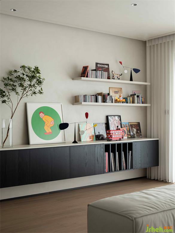 在沙發(fā)后定制了一排開闊實(shí)用的陳列展示架,深圳金眾麒麟公館裝修設(shè)計(jì)用來展示與收納屋主收藏的CD和唱片等喜歡的家居小物件。