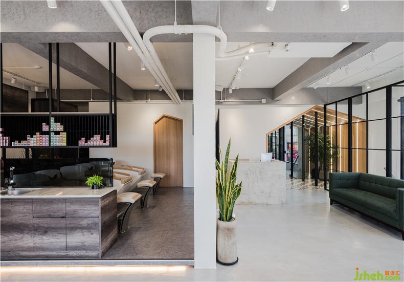 候鳥遠飛,也渴望一個巢。遠離家鄉(xiāng),在新竹工作的科技業(yè)人士,想要的是一個家。這裡,也許只是一家沙龍,但更期許這裡是候鳥們能偶爾駐足停歇,沉靜放松的「巢」。坐落于清大夜市二樓的巢二居,是一株生長于鬧區(qū)樹梢的家巢。在迎向二樓的入口,創(chuàng)造木屋的意象,宛若等候故人歸來的家門,此處也是客人變換全新造型拍照打卡的好地方。自然粗獷的水泥地坪延展空間尺度,點綴空間的植物與勁直的光線,是衝破水泥桎梏的生命力,就如同人們在這裡接受造型師的巧手重新整理了自己,又能夠回去面對都市叢林的挑戰(zhàn)。原初、自然、不造作,是群暉設(shè)計給年輕造型師團隊與客人們最好的禮物。室內(nèi)設(shè)計師