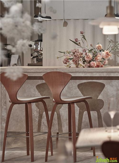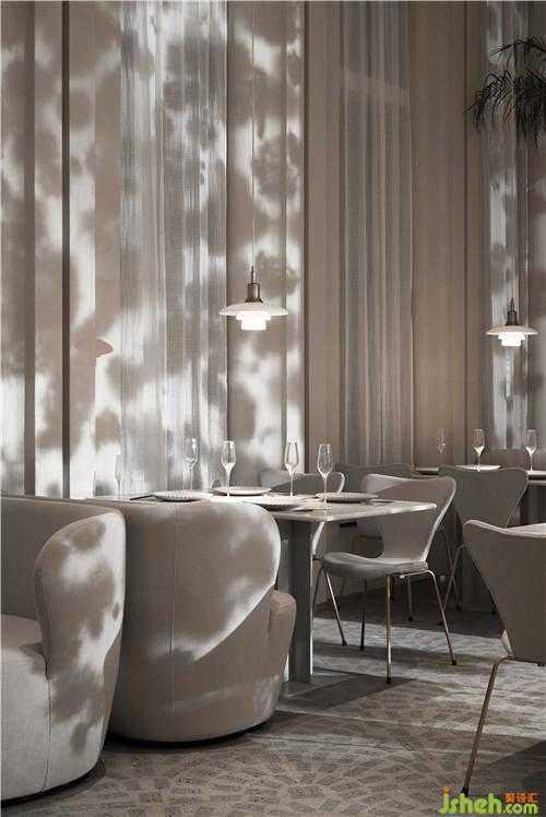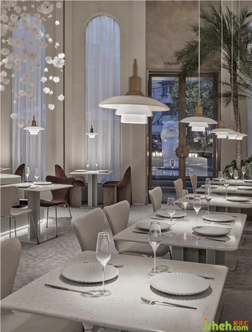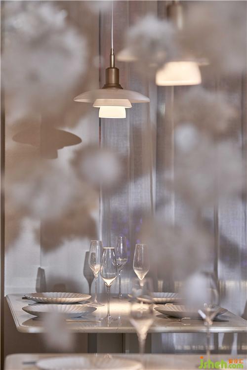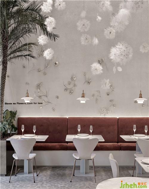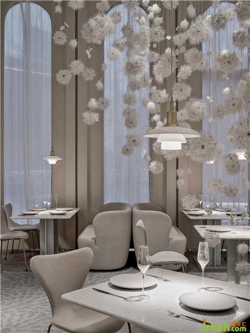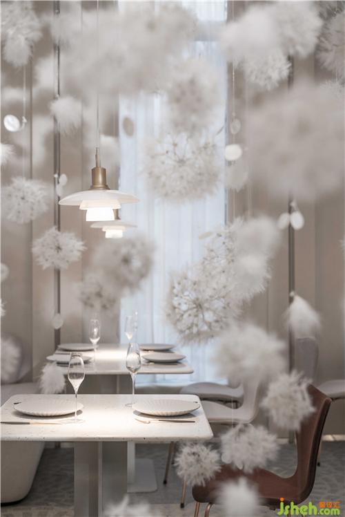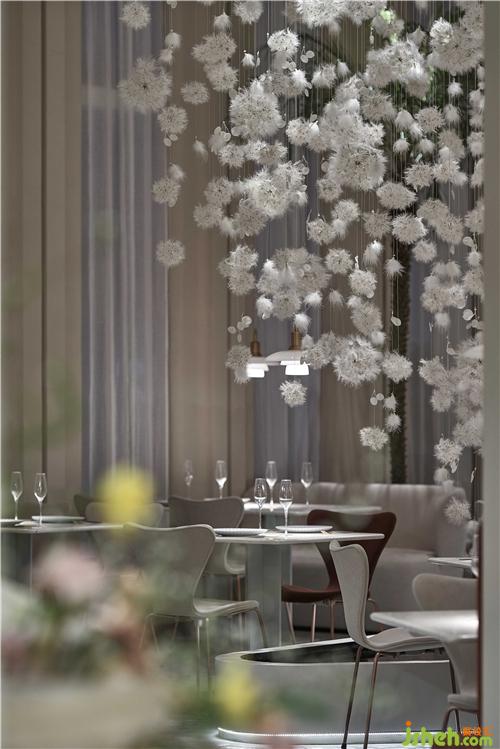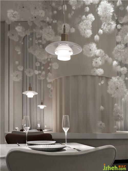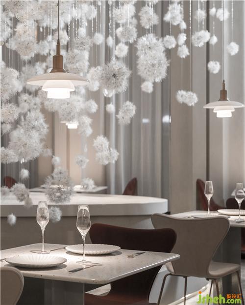 空間的物體線索來自蒲公英,我們設(shè)想蒲公英隨風(fēng)飄向大自然的和諧性,來自于生物和環(huán)境的有機(jī)互動(dòng),種子從母體脫離,散開飄動(dòng)時(shí)產(chǎn)生的一種自然優(yōu)美感;于是設(shè)計(jì)師提取了蒲公英的概念去詮釋花廚的意義,上海餐廳設(shè)計(jì)把蒲公英的形態(tài)重新抽離組合,形成一種新的裝置藝術(shù)表現(xiàn)與空間對(duì)話,又相互彼此的消化著蒲公英的形態(tài);把藝術(shù)裝置作為主體,客戶作為飄散的另一個(gè)載體,嘗試將美好和美食傳播到外界。
