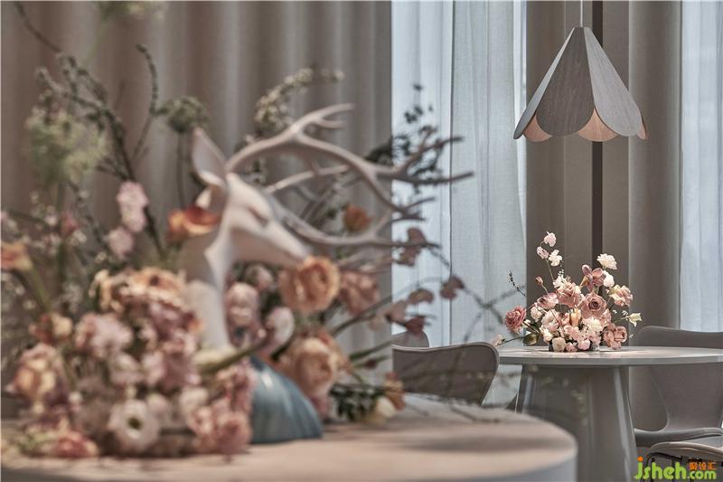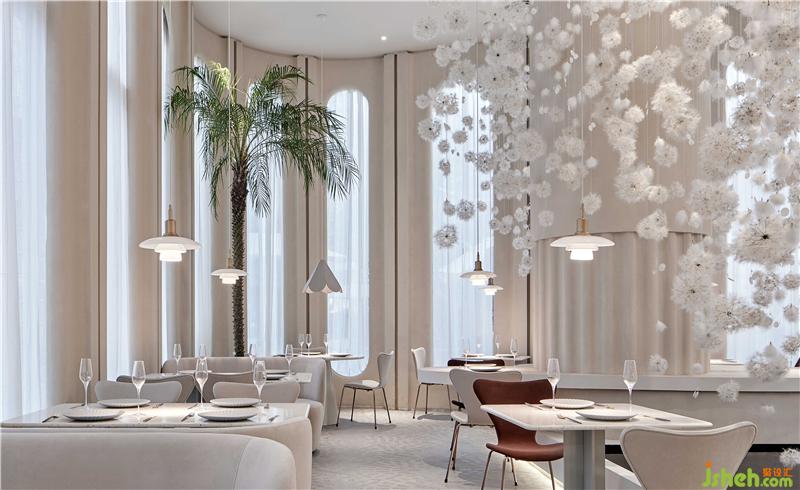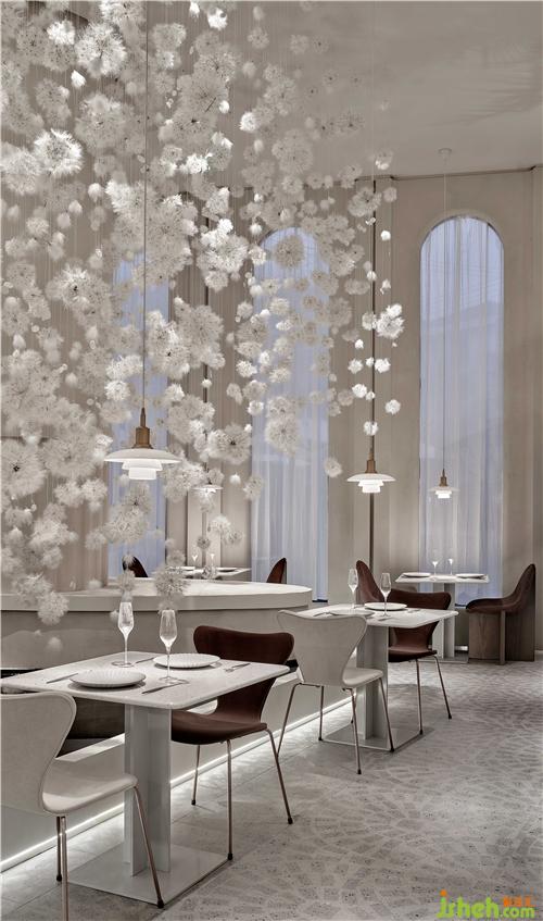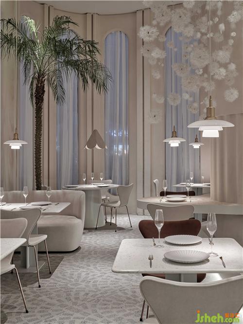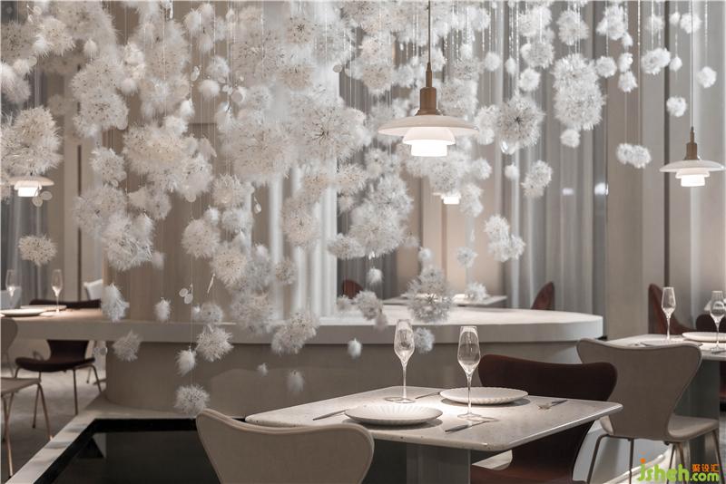設(shè)計師從建筑師彼得·卒姆托提出的“custom-made architecture(客制建筑)”的理念,強調(diào)空間與在地環(huán)境相互融合,在整個內(nèi)外立面的構(gòu)造關(guān)系中,上海餐廳設(shè)計為了隱藏了原有建筑中存在的鋼架結(jié)構(gòu)外貌,設(shè)計師結(jié)合了上海法租界的歷史建筑和當(dāng)下建筑,重新整理有序,構(gòu)造出拱形門窗的建筑形態(tài),原本直白的光線通過拱形結(jié)構(gòu)的影響,通過時間的變化而改變著光影進(jìn)入室內(nèi)的樣貌,當(dāng)人和光同時進(jìn)入時,蒲公英又感知到風(fēng),擺動在空中時,光線、空間與人之間的對話,整個空間就充滿了驚喜和滿足。設(shè)計師把其中一面墻將花藝半嵌入墻體,用肌理涂料將其涂抹,將墻面的唯美與蒲公英裝置形成靜與動的有趣結(jié)合。