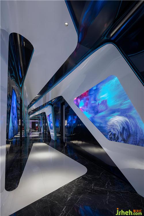 使用烤漆鋁板、鏡面不銹鋼和LED異形屏的結合,并以連貫的線條燈光作為導引,提取未來感、撕裂再重構的元素縱橫貫穿了整個走廊。
