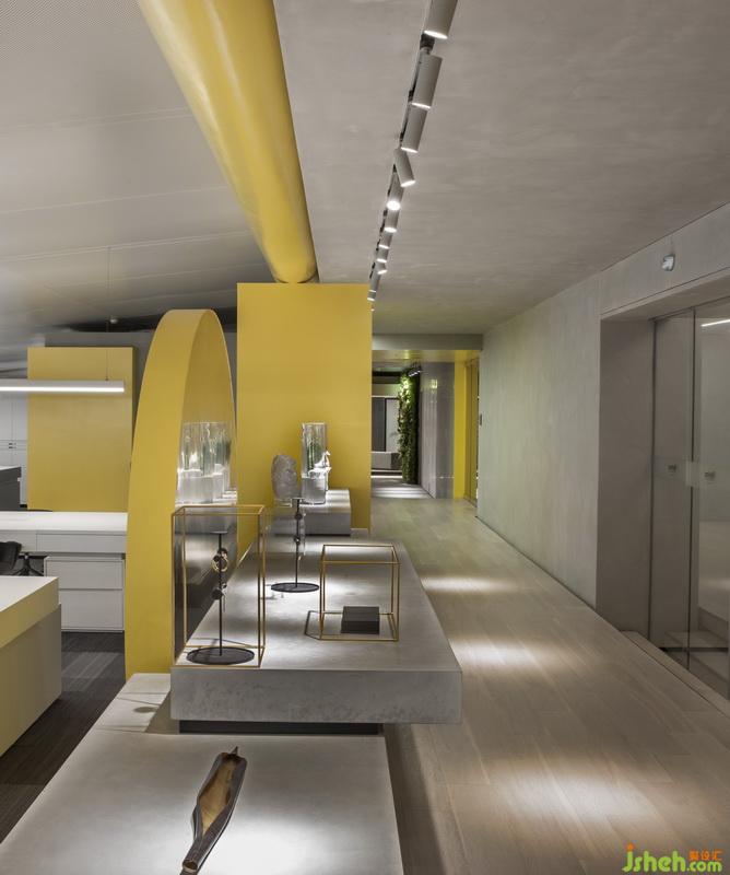 延續(xù)費(fèi)羅娜的企業(yè)和產(chǎn)品風(fēng)格,用代表“砼”的力量灰為主色調(diào),統(tǒng)一應(yīng)用在天、地、墻面,圓、方、三角形態(tài)的溫柔黃色穿行在“力量”灰調(diào)中,通過曖黃色的燈光渲染,力量與溫情的高度溶合,便是設(shè)計(jì)師對(duì)費(fèi)羅娜的設(shè)計(jì)靈魂所在,也正是簡(jiǎn)約風(fēng)格的所在。