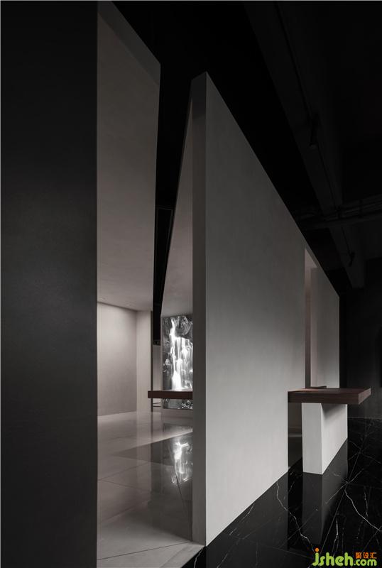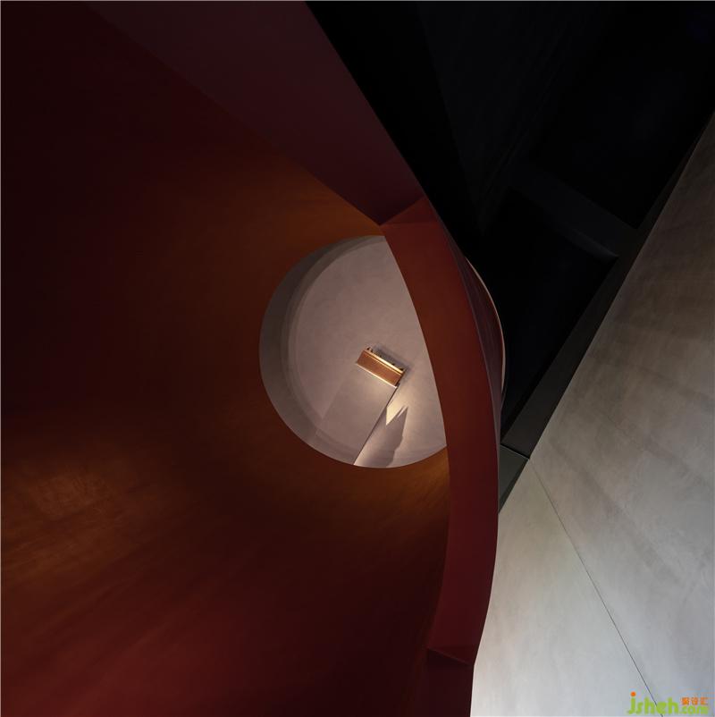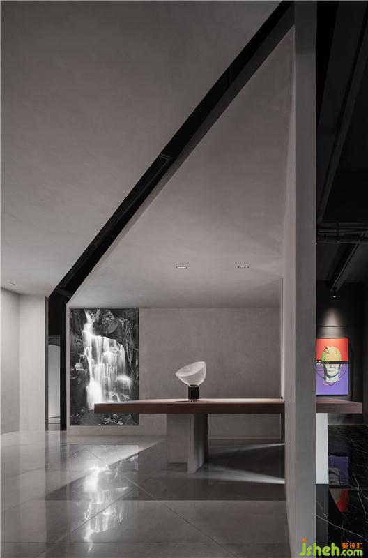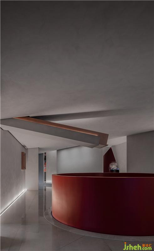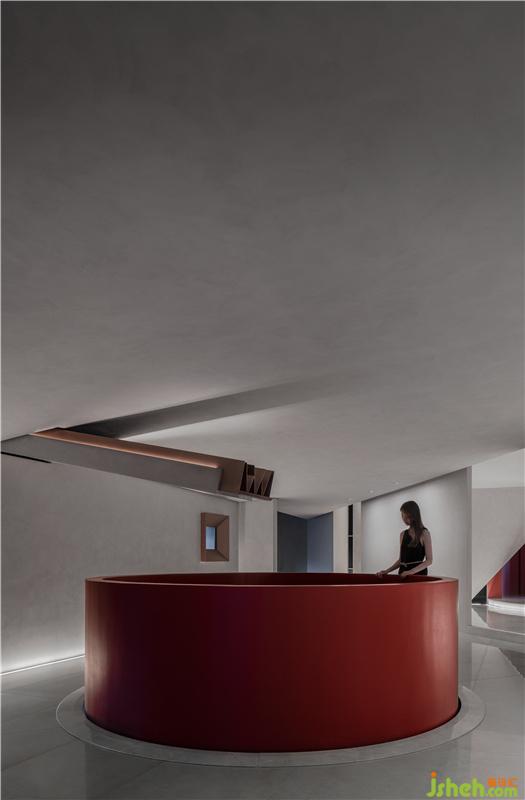 梯、方、圓,形態(tài)各異的體塊,錯(cuò)落疊合。入口設(shè)計(jì)在隱于方形體塊一側(cè),佛山辦公室設(shè)計(jì)無任何裝飾的水泥灰白,有種猜不透的冷靜感,脫俗而低調(diào)的門面躍然而現(xiàn)。