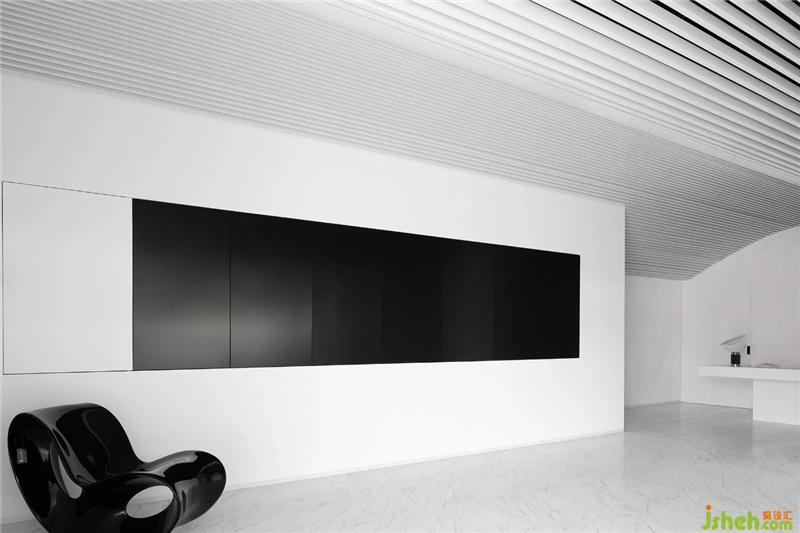 白色的鋁通管從建筑外立面的頂端拉至一層的天花,筆直的線(xiàn)條猶如織布機(jī)上一排排整齊細(xì)密的紗線(xiàn),包裹著建筑。