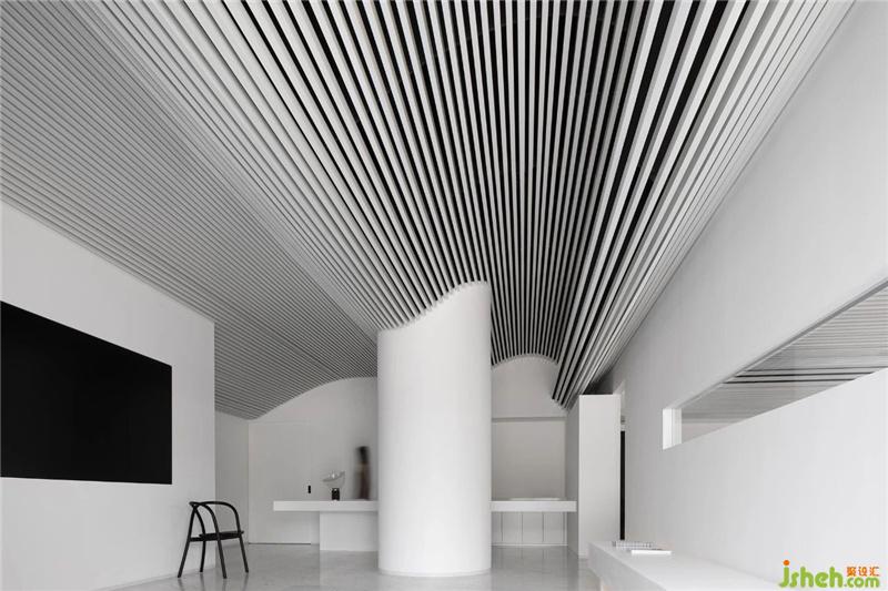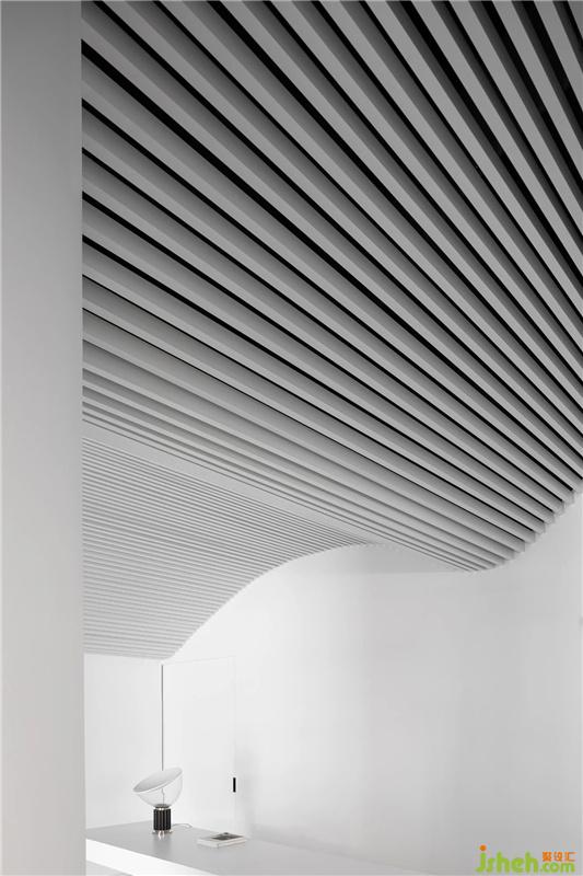 鋁通從二層建筑頂部平直的起點(diǎn)拉至一層后,調(diào)節(jié)不同的收尾長(zhǎng)度在同一平面形成曲線(xiàn),并與室內(nèi)的曲度一致,給人以建筑外墻的鋁通從建筑頂部一直貫穿至一層天花的即視感。