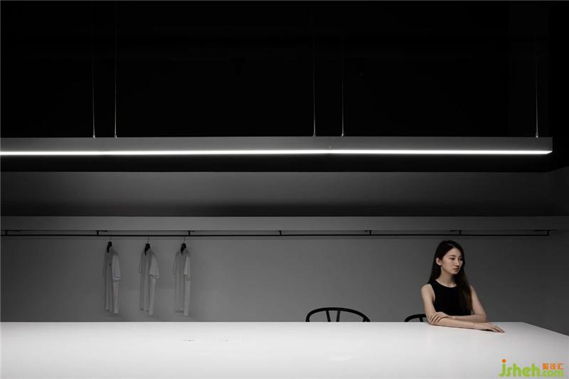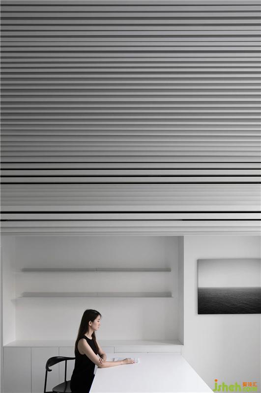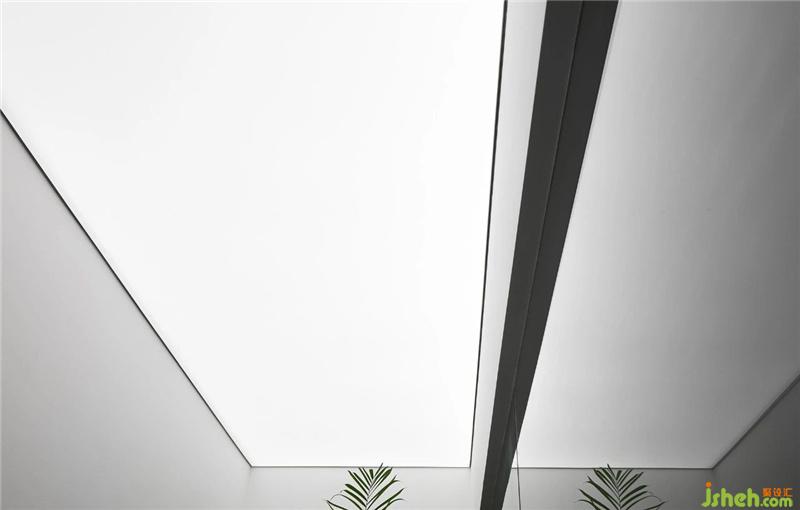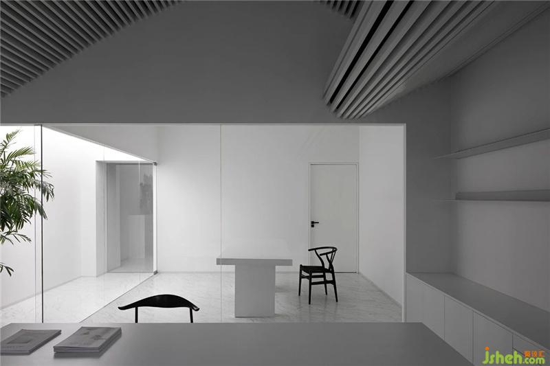 室內(nèi)進門左排依次是接待室和兩間獨立辦公室,最主要的問題是沒有采光和不通風。設計師在這三間房的側(cè)邊間隔出一個通道,佛山辦公室設計用軟膜天花和人造光打造成一個如能透進自然光的“天井”,解決采光問題。其次通道連接三間房,打開接待室的后門,風可以直接從通道引進另外兩間辦公室。