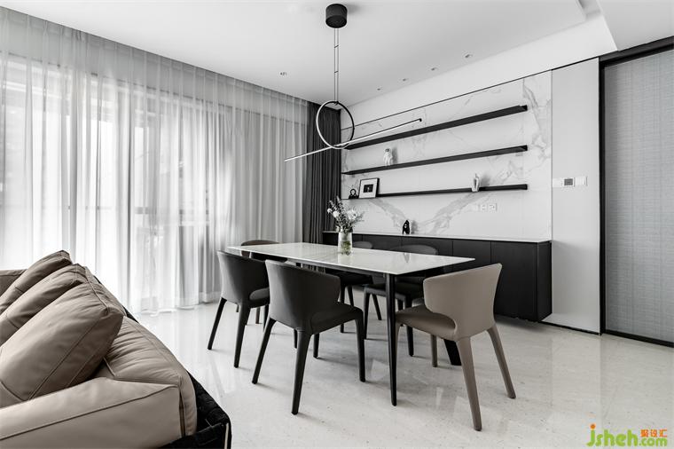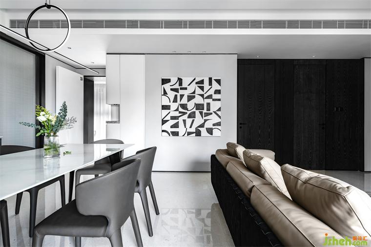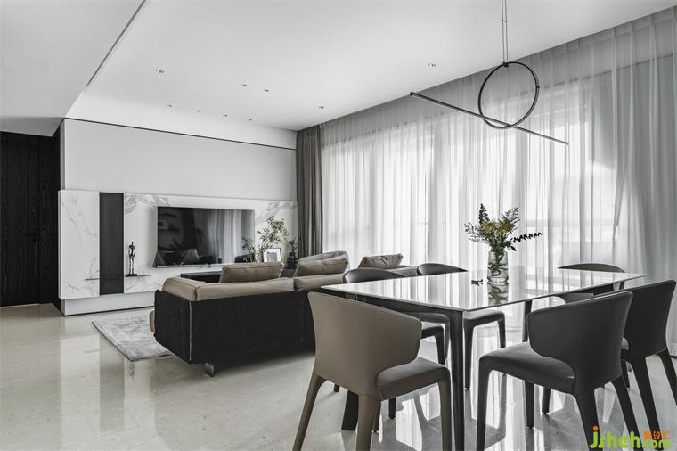 客餐廳作為家中最核心的區(qū)域,見證著這個(gè)家所有歡聚的時(shí)刻,華潤潤府裝修設(shè)計(jì)整個(gè)空間依然延續(xù)著黑白灰的主色調(diào),電視墻和餐邊柜在兼顧儲(chǔ)物的同時(shí),也做了適當(dāng)?shù)牧舭滋幚?,給了空間更多的呼吸感。