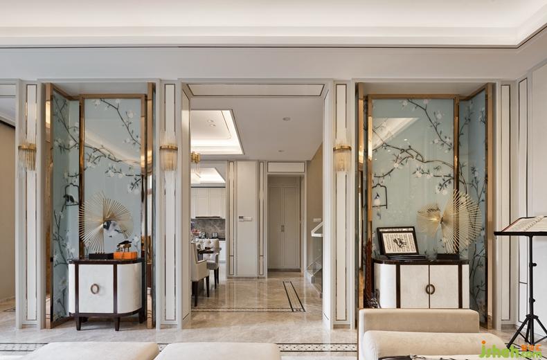 主要材料08下疊:香檳色亮光漆,羅馬天使大理石,云灰石大理石,帕斯高灰大理石,藝術(shù)玻璃,花鳥(niǎo)墻紙,皮雕