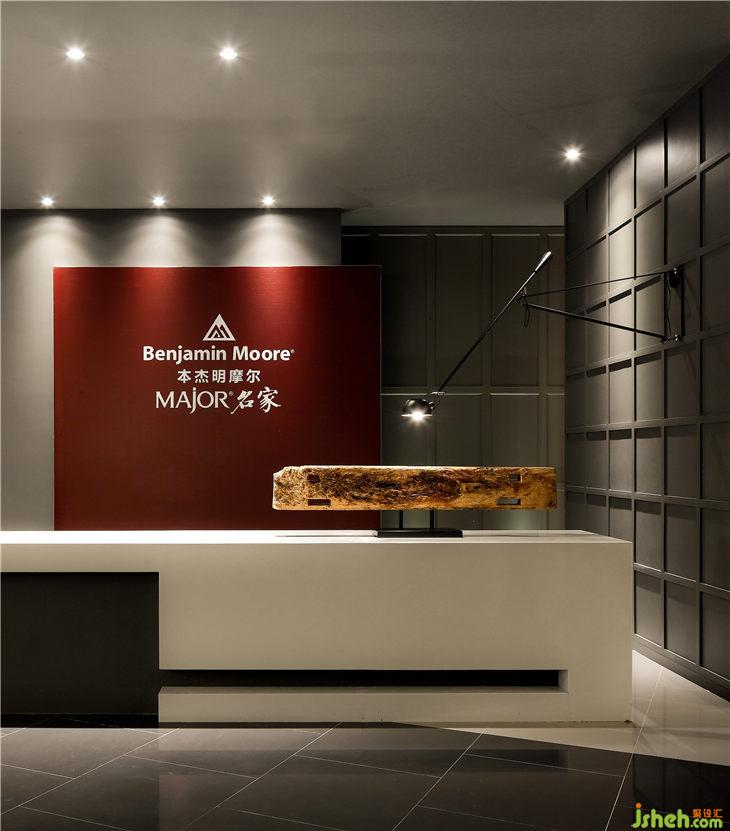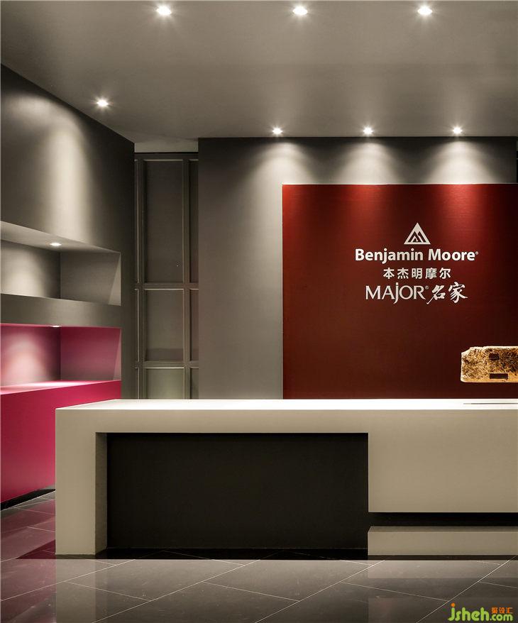 因而項(xiàng)目整體的設(shè)計(jì)并沒有加入太多商業(yè)化的行為,本杰明摩爾的行業(yè)地位也決定了它根本無需那樣過度的包裝。在這樣一個(gè)200平的場地里,除了必要的展示區(qū),設(shè)計(jì)師留出了足夠的空間用以會見、洽談、休憩和行走。平面結(jié)構(gòu)上,考慮到各區(qū)域的獨(dú)立性、關(guān)聯(lián)性與實(shí)用性,選擇利用墻體來作為展示產(chǎn)品實(shí)際涂裝效果的載體,一方面明確了本杰明摩爾涂料的獨(dú)特肌理和色彩厚度,另一方面也賦予空間清晰的體塊關(guān)系。
