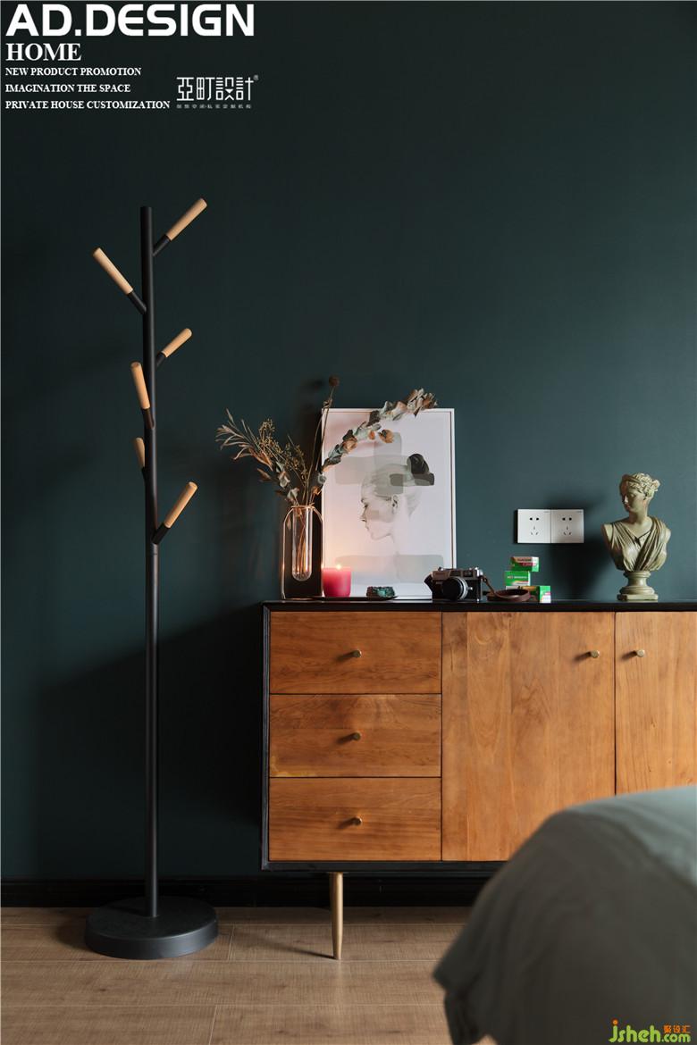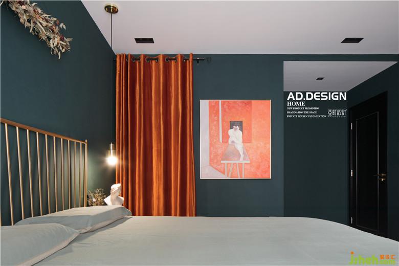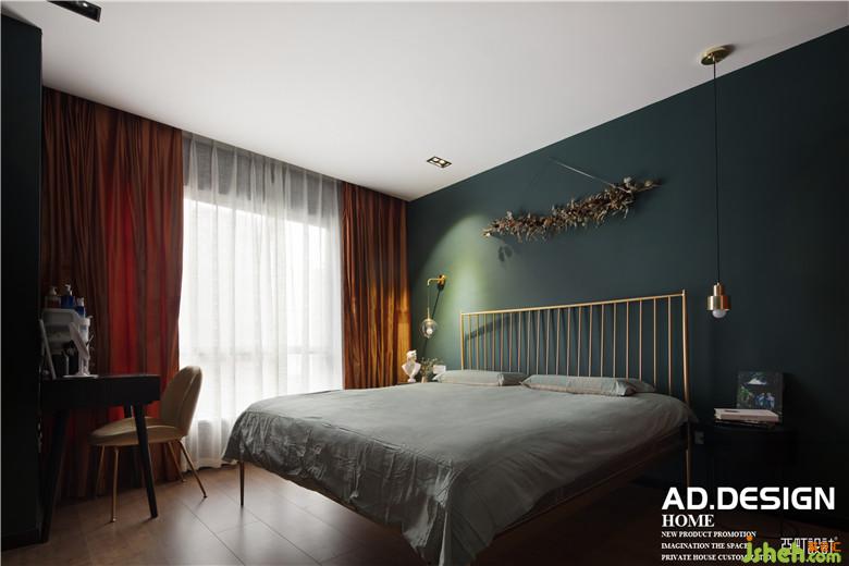 主臥全房的乳膠漆顏色室內(nèi)設(shè)計(jì)師都采用暗沉?xí)崦恋哪G色,點(diǎn)綴些許杏紅色在窗簾布料以及裝飾畫上,搭配上金色的鐵藝雙人床,讓整個空間的軟裝配飾更加突出。