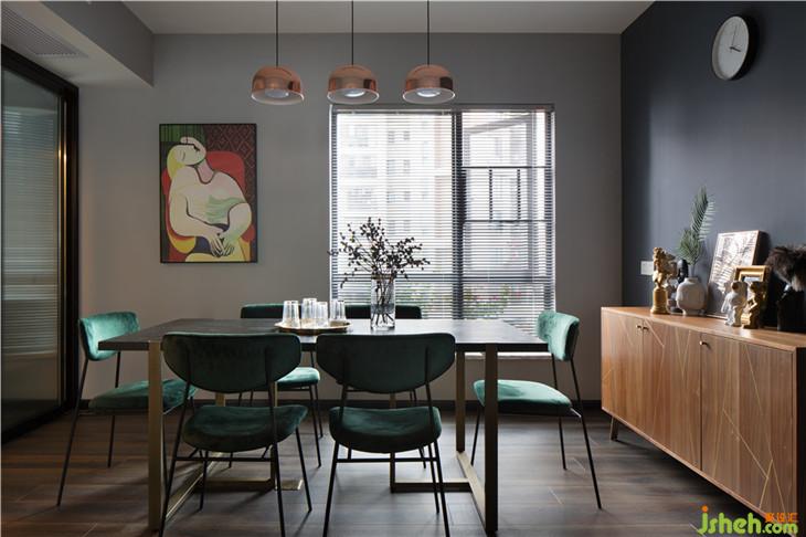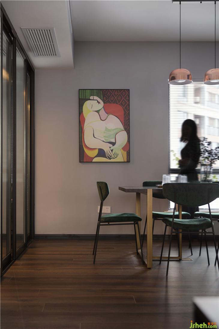 餐廳的餐邊柜墻面的煙灰藍(lán)與客廳的沙發(fā)背景墻遙相呼應(yīng),長(zhǎng)方形的八人餐桌搭配墨綠色餐椅滿足日常以及有客人到來的時(shí)的需求,而從客廳面對(duì)餐廳的墻上掛著一幅畢加索的《夢(mèng)》,則是整個(gè)餐廳的點(diǎn)睛之筆,這幅畫不僅僅是作為提升整個(gè)空間的藝術(shù)氛圍而使用。畢加索用最簡(jiǎn)單的繪畫表現(xiàn)出了一個(gè)在夢(mèng)境和現(xiàn)實(shí)中的少女,心形的臉,是熱戀中愛的寫照。當(dāng)年,47歲的畢加索與長(zhǎng)著一頭金發(fā)的17歲少女初次相遇,從此,這位少女便一直成為畢加索繪畫和雕刻的模特。又過17年,64歲的畢加索給她的生日賀信中說:“對(duì)我來說,今天是你17歲生日,雖然你已度過了兩倍的歲月。在這個(gè)世界上,與你相遇才是我生命的開始?!蓖瑯拥模煨℃づc陸先生的初次相遇,也是作為陸先生攝影的模特,也許畢加索的這段話,正是陸先生要對(duì)徐小妞想要說的最溫暖的情話。