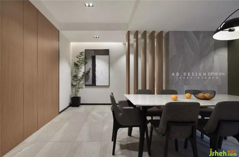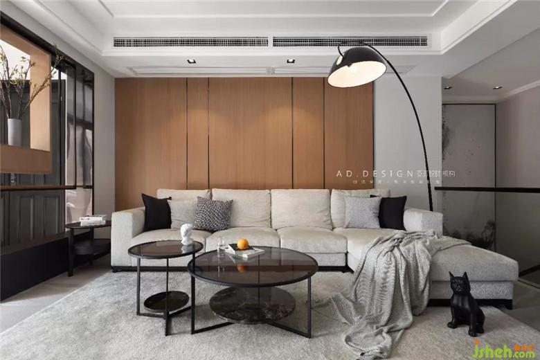 ▲沙發(fā)背景墻設(shè)計結(jié)合木飾面與不銹鋼組合,不銹鋼與加長的空調(diào)出風(fēng)口拉伸空間比例,化解了沙發(fā)面寬過窄的弱點,釣魚燈既能滿足區(qū)域照明需求,也使得原有棱角分明的方正空間增添靈動感及趣味性。